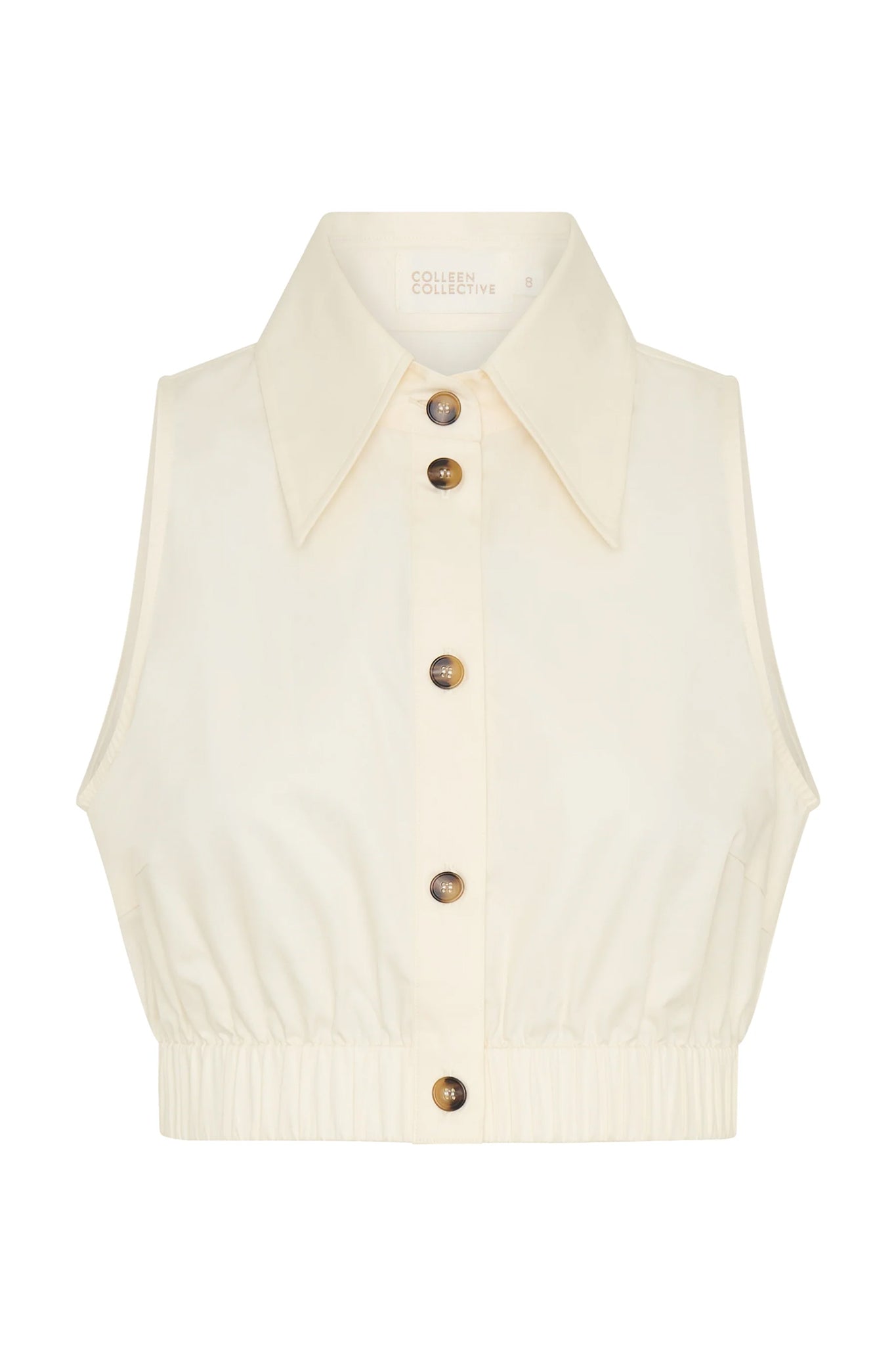 A modern interpretation of the classic shirt, the Lillian crop top is tailored from our core cotton twill fabrication, combining structure and softness. Oversized statement collar and contrast faux horn buttons blend vintage-inspired details with a contemporary cropped silhouette. Pair effortlessly with the coordinating Lillian midi skirt or high-waisted separates.