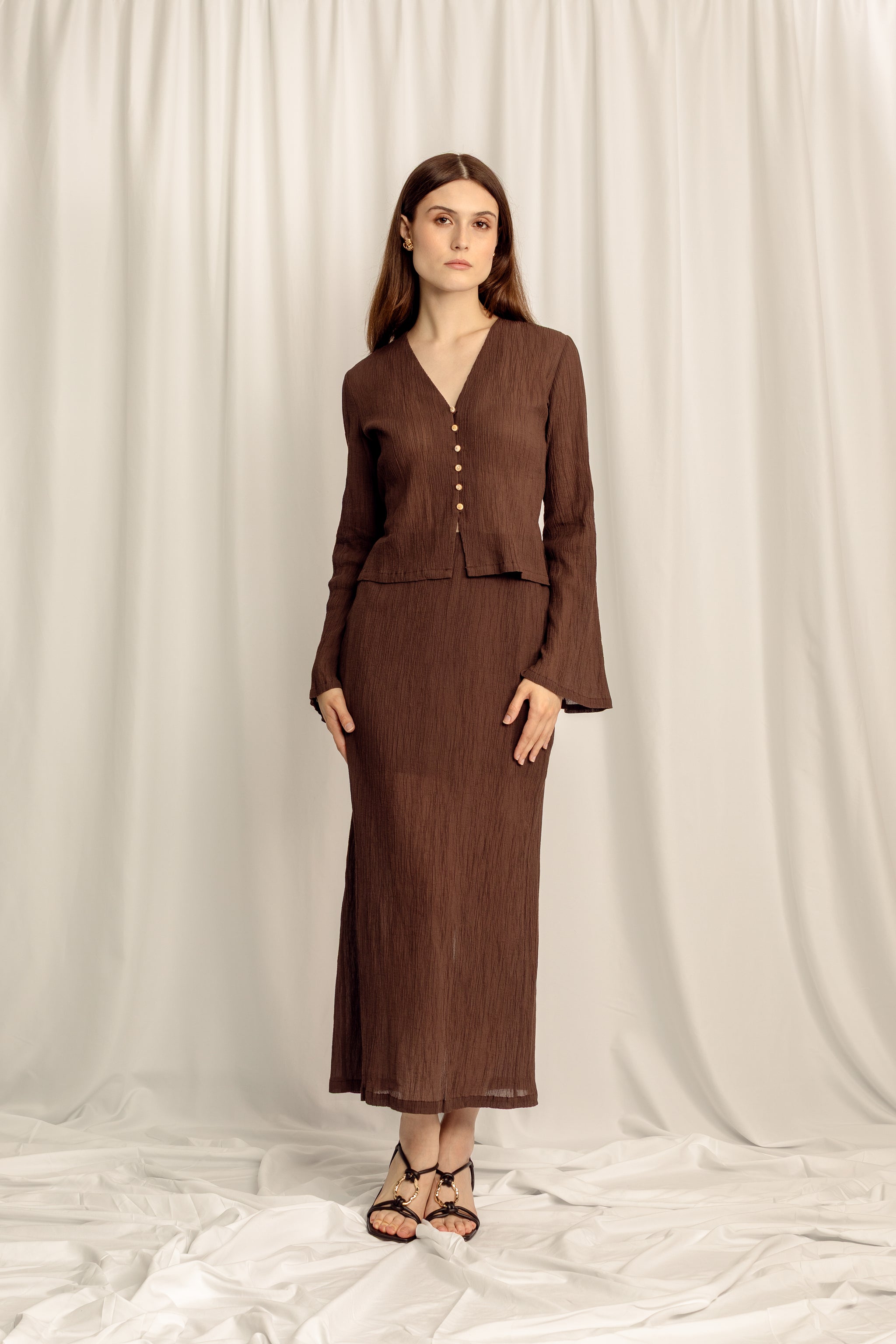 Crafted from 100% crinkle-textured cotton, this long-sleeved shirt balances relaxed comfort with natural shell buttons for a subtle, elevated detail. Flared sleeves and a V-neckline create a modern, airy silhouette, while the removable waist tie defines the waist for a versatile fit. Pairs effortlessly with the matching Evelina A-line mini or maxi column skirt.